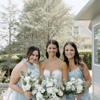 Jess carried a bouquet of lush white roses, ranunculus, lisianthus, and delphinium, tied with silk ribbon and full of soft texture and movement. Her bridesmaids wore a mix of dusty blue and floral-patterned gowns, each holding a classic white bouquet that complemented the coastal palette.